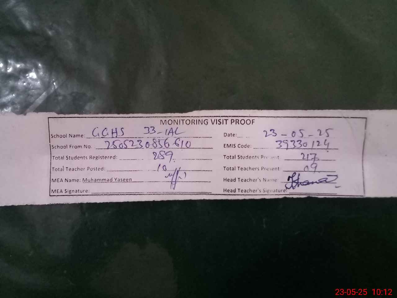 | Attendance Register | Head Teacher | MEA with School | Visit Proof |
