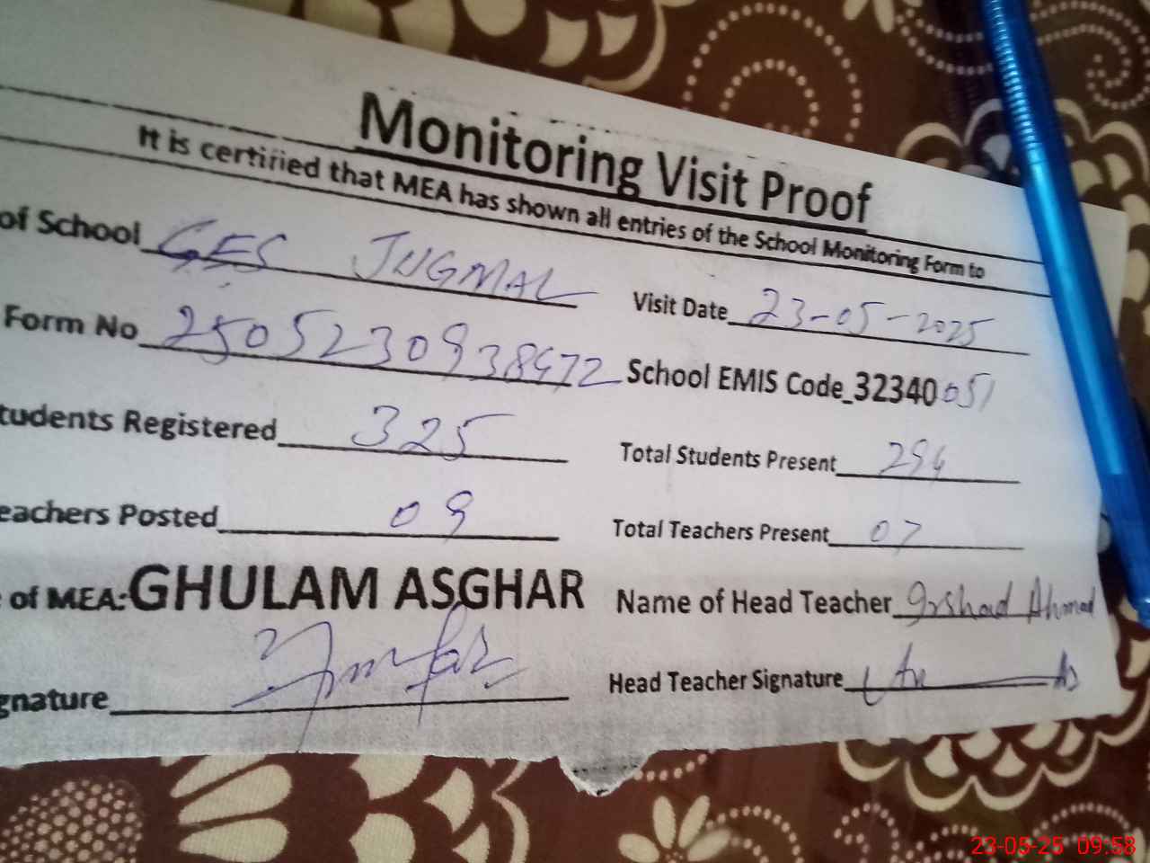 | Attendance Register | Head Teacher | MEA with School | Visit Proof |