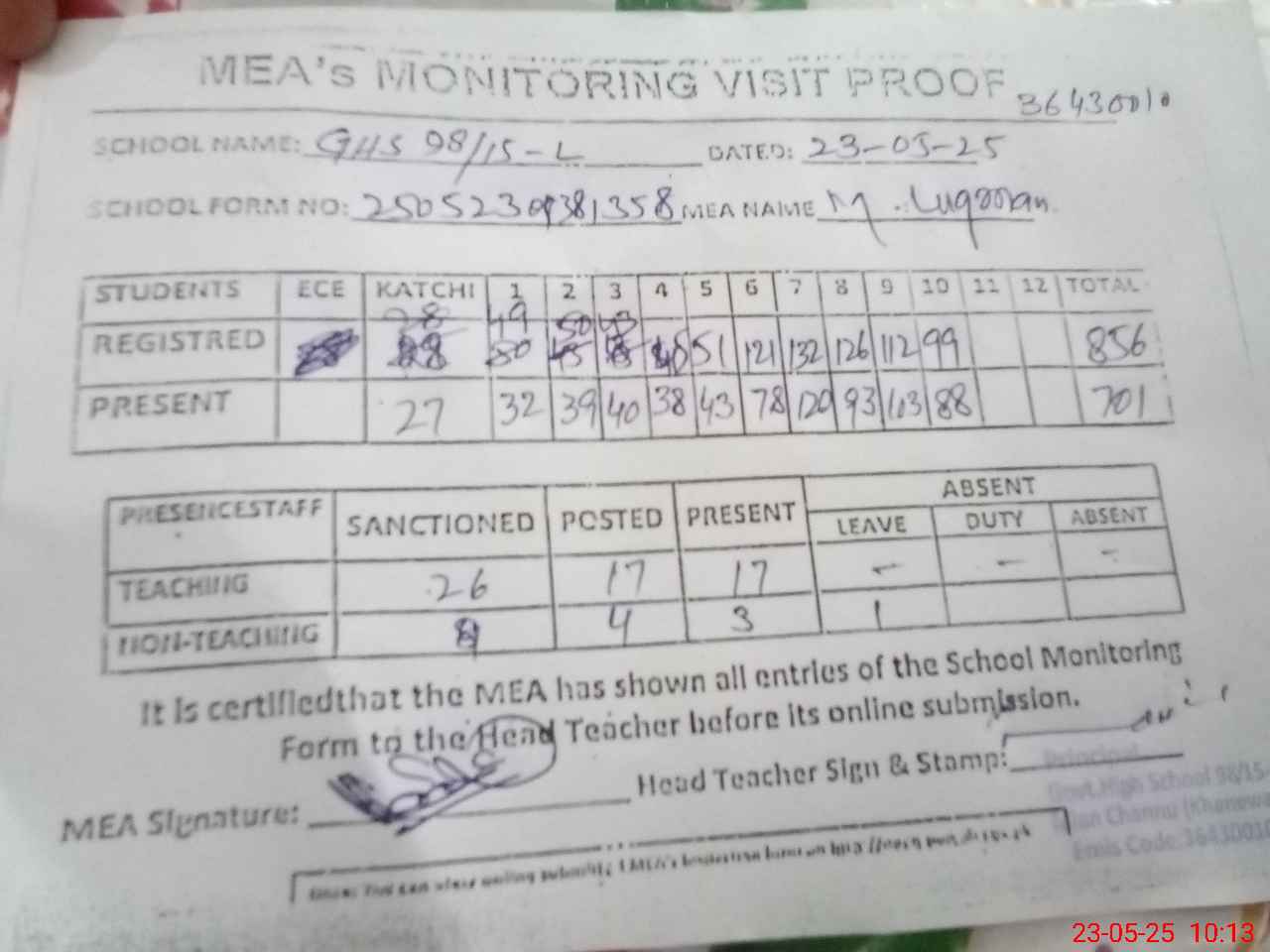 | Attendance Register | Head Teacher | MEA with School | Visit Proof |