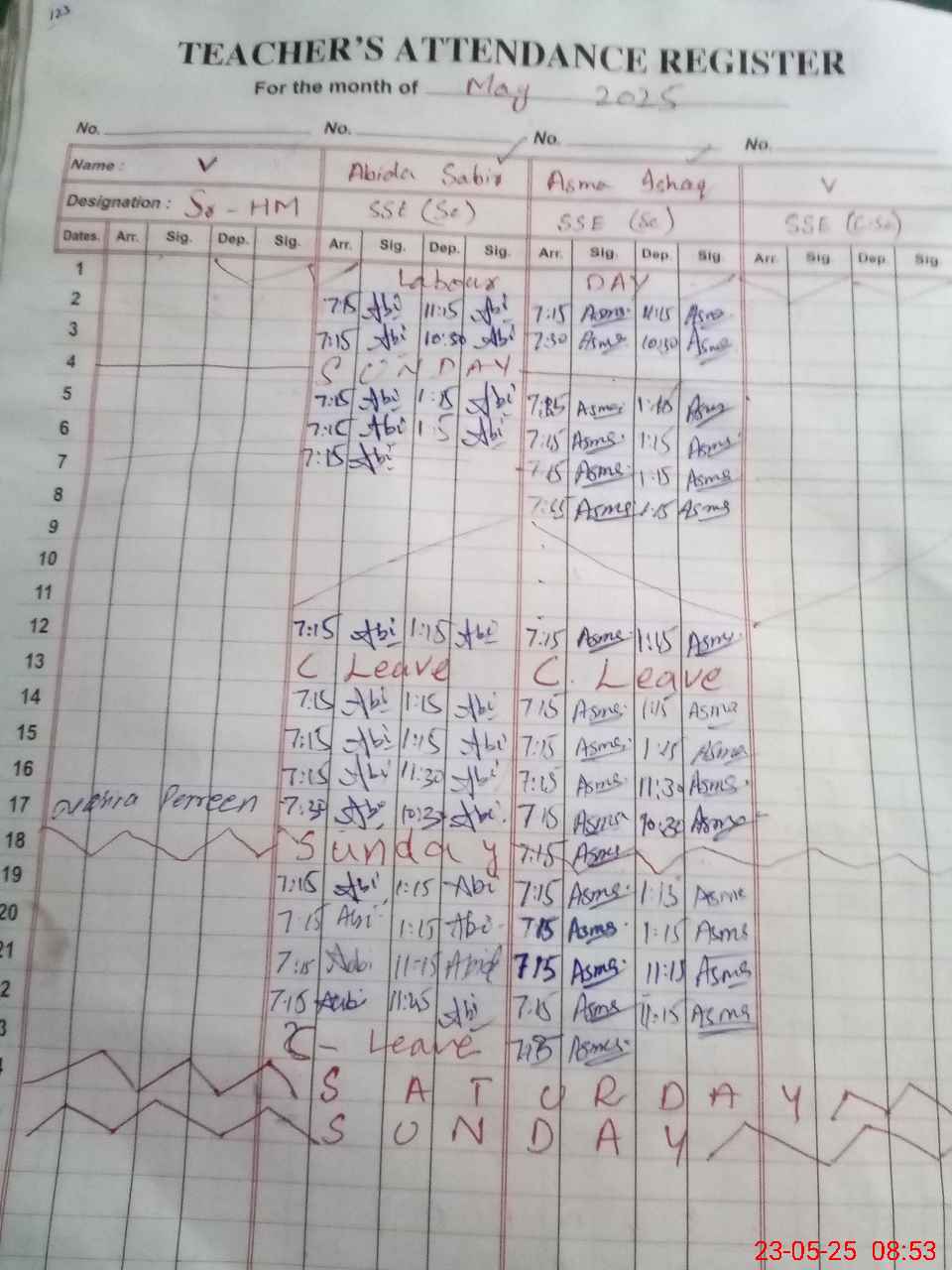 | CNIC | Full Name | Designation | R/C | Absence During Last Calender Month |