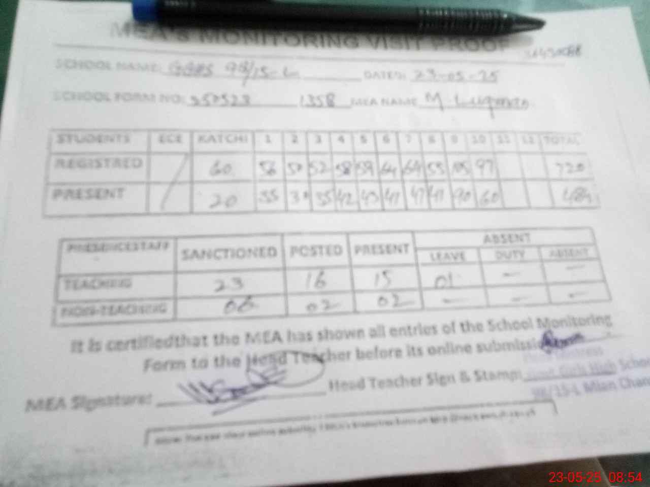 | Attendance Register | Head Teacher | MEA with School | Visit Proof |