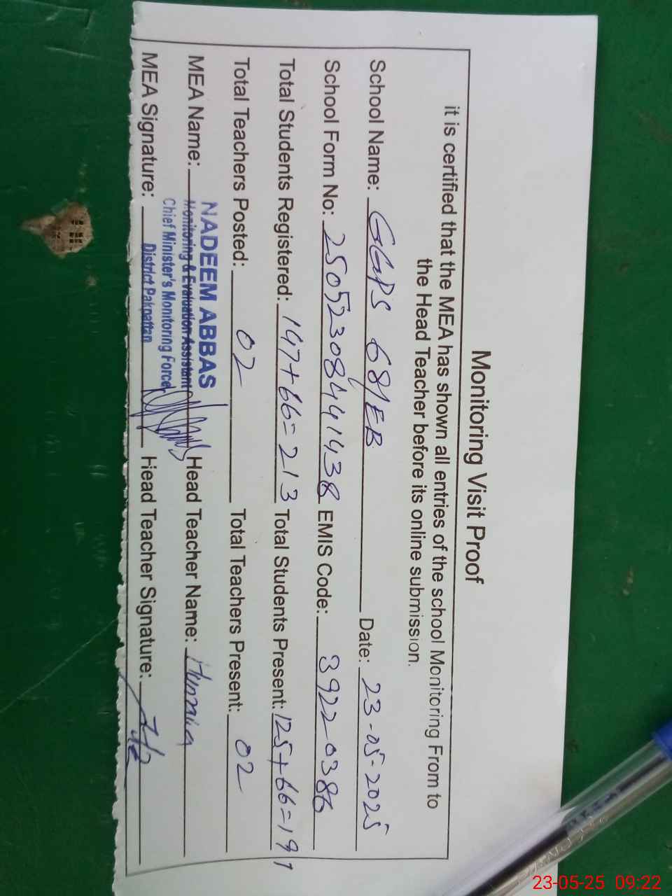 | Attendance Register | Head Teacher | MEA with School | Visit Proof |