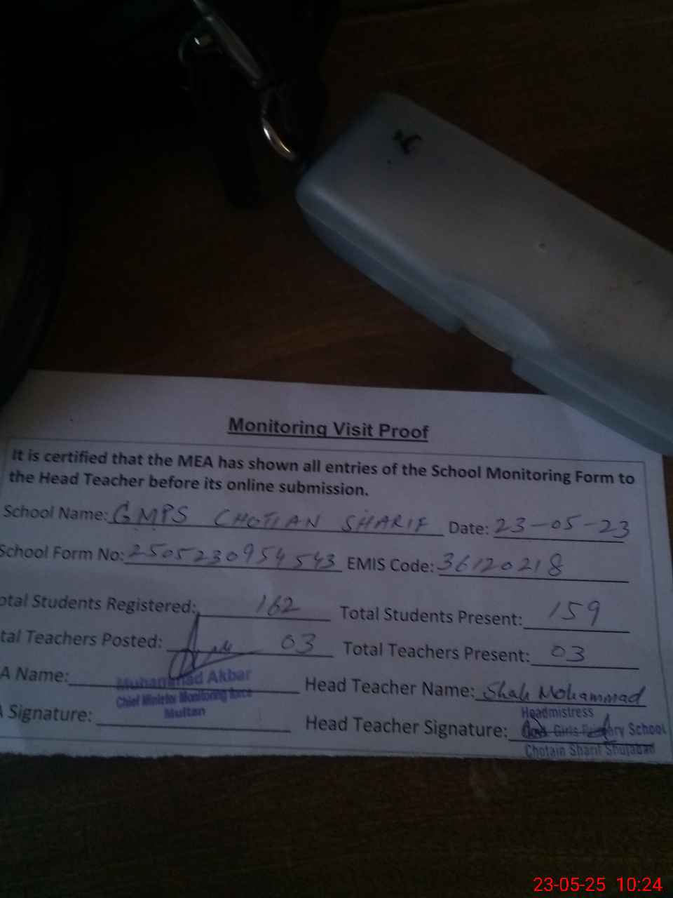| Attendance Register | Head Teacher | MEA with School | Visit Proof |