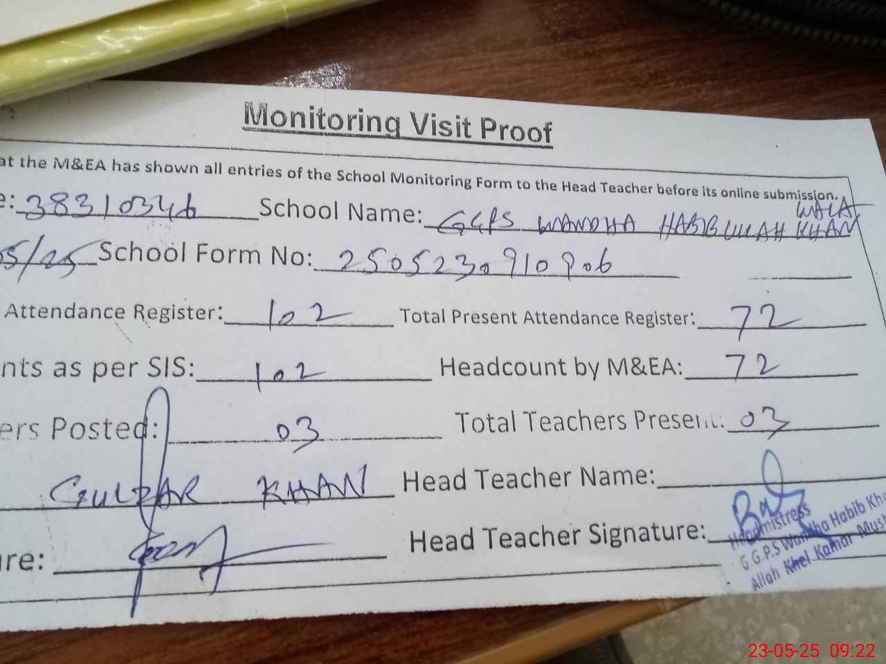 | Attendance Register | Head Teacher | MEA with School | Visit Proof |
