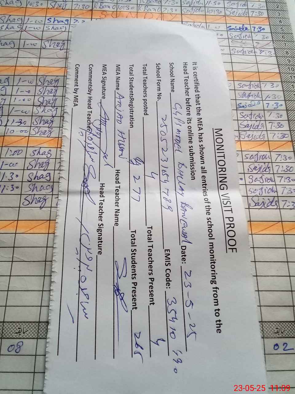 | Attendance Register | Head Teacher | MEA with School | Visit Proof |