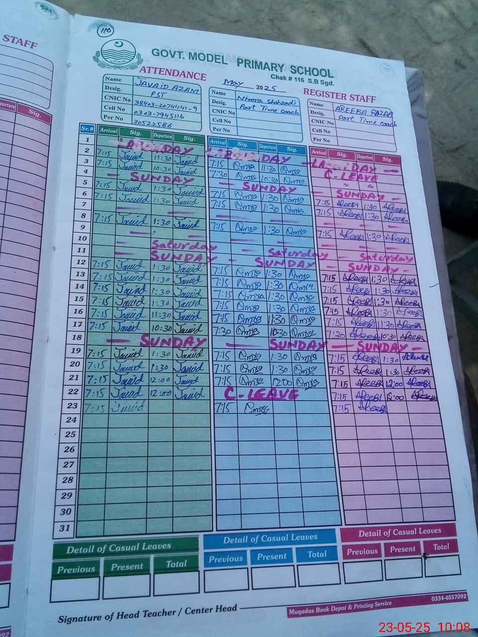 | Name: Ja**** Az**** Designation: (School Headmaster's/Headmistress's) PST (SCI ) Phone/Cell Number: 03**** |