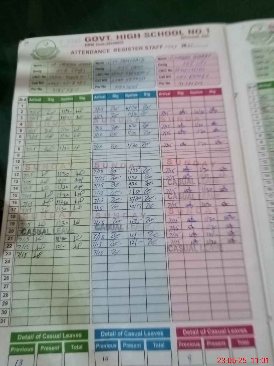 | CNIC | Full Name | Designation | R/C | Absence during last cal. month |