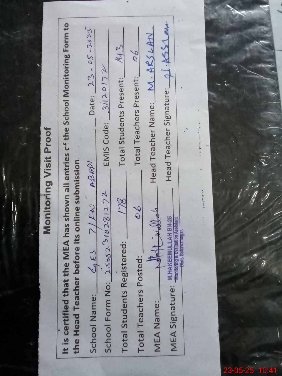 | Attendance Register | Head Teacher | MEA with School | Visit Proof |