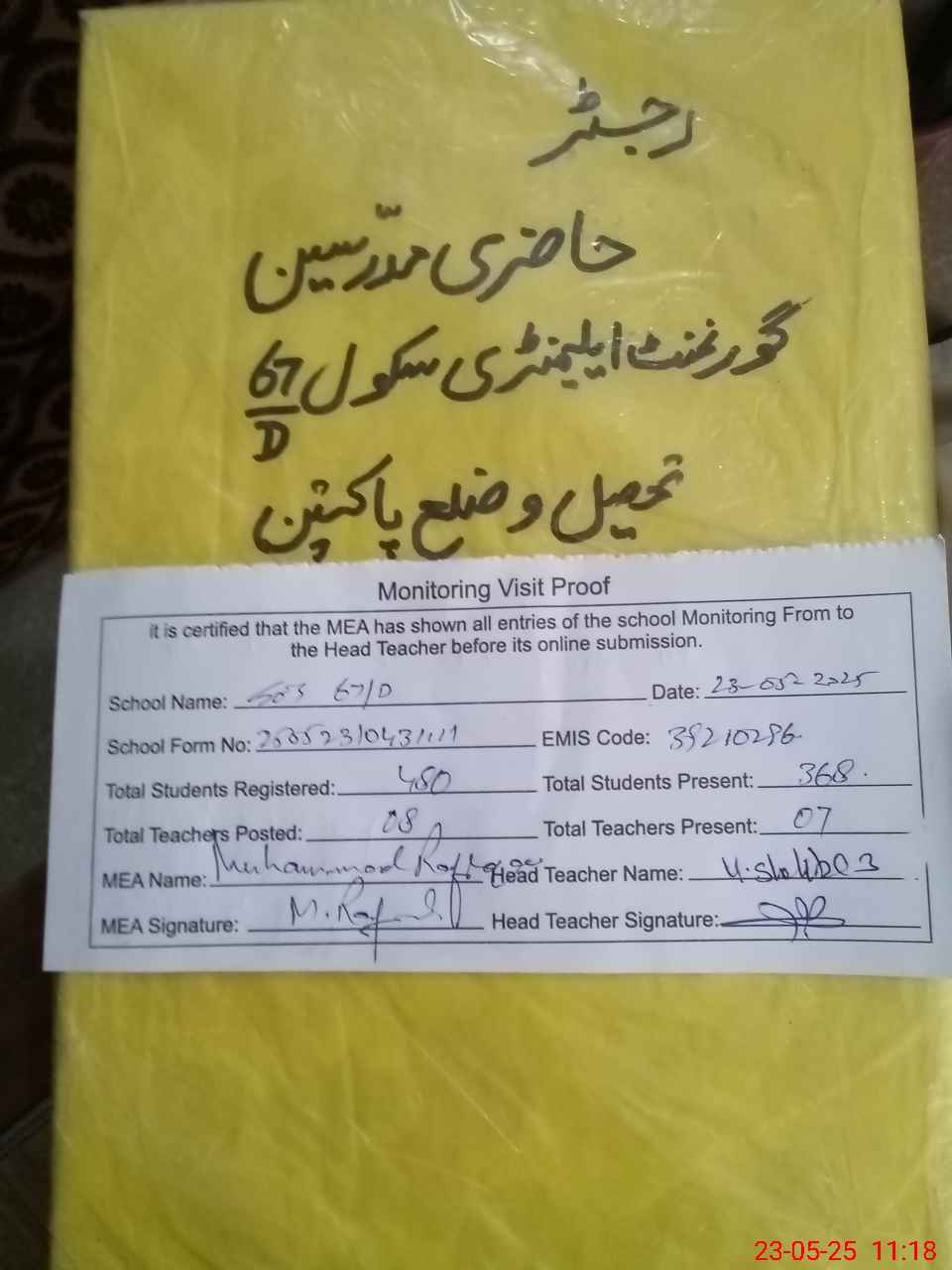 | Attendance Register | Head Teacher | MEA with School | Visit Proof |