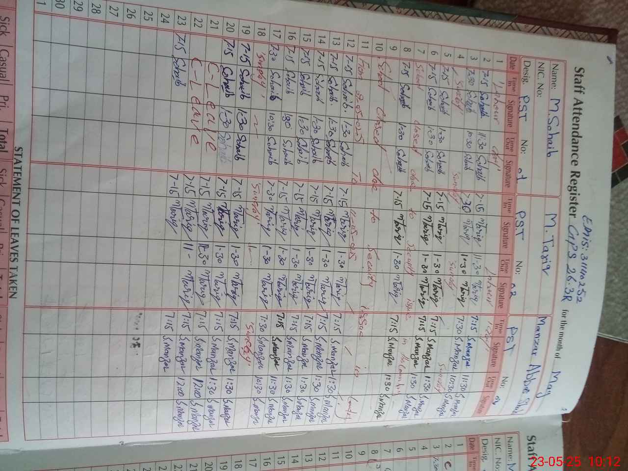 | CNIC | Full Name | Designation | R/C | Absence During Last Calender Month |