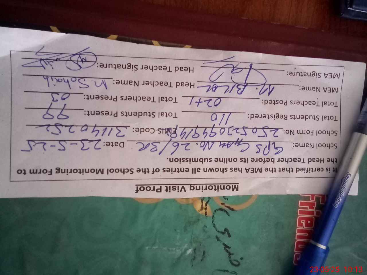 | Attendance Register | Head Teacher | MEA with School | Visit Proof |