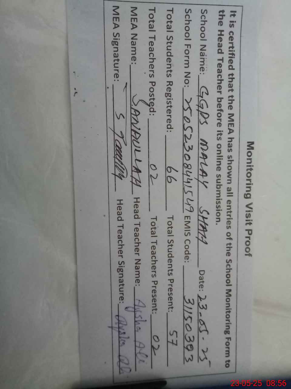 | Attendance Register | Head Teacher | MEA with School | Visit Proof |