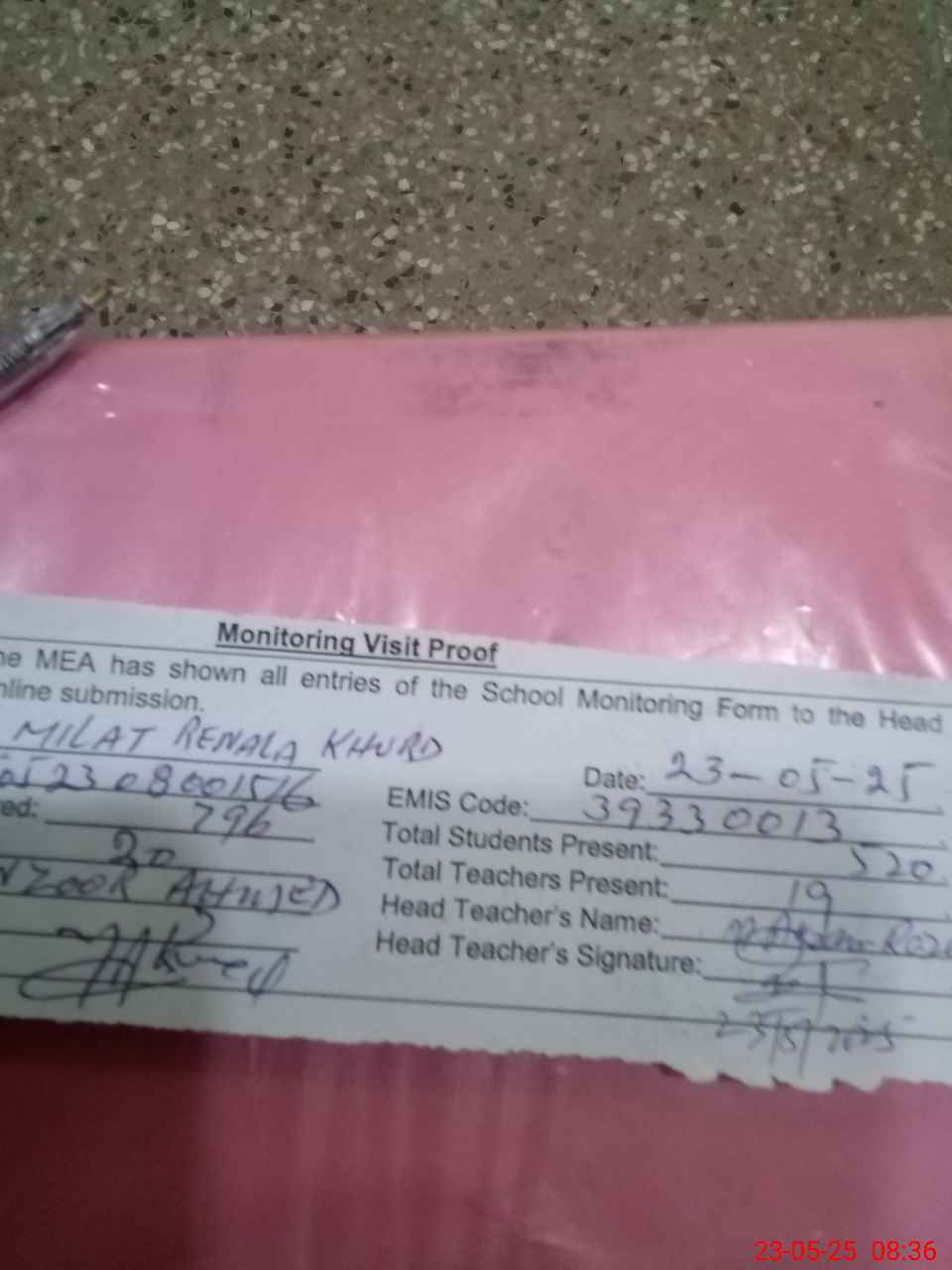 | Attendance Register | Head Teacher | MEA with School | Visit Proof |