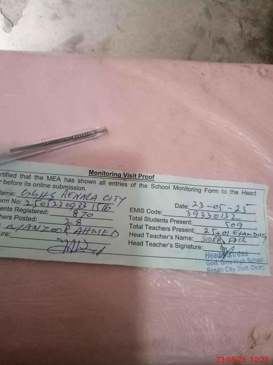 | EMIS Code: 39330132 | Name of School: GGHS RENALA CITY | |||