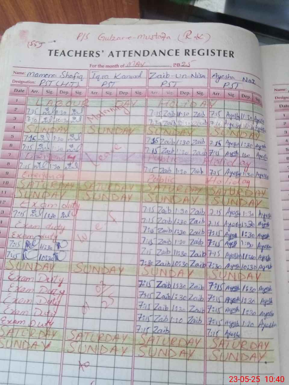 | 35**** | Ma**** Sh**** | PST | Regular | 0 | 0 | 0 | 0 | 0 | 0 | 0 | 0 | 0 | Exam Duty |