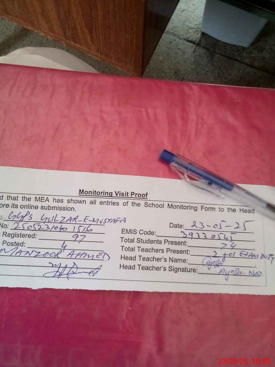 | Attendance Register | Head Teacher | MEA with School | Visit Proof |