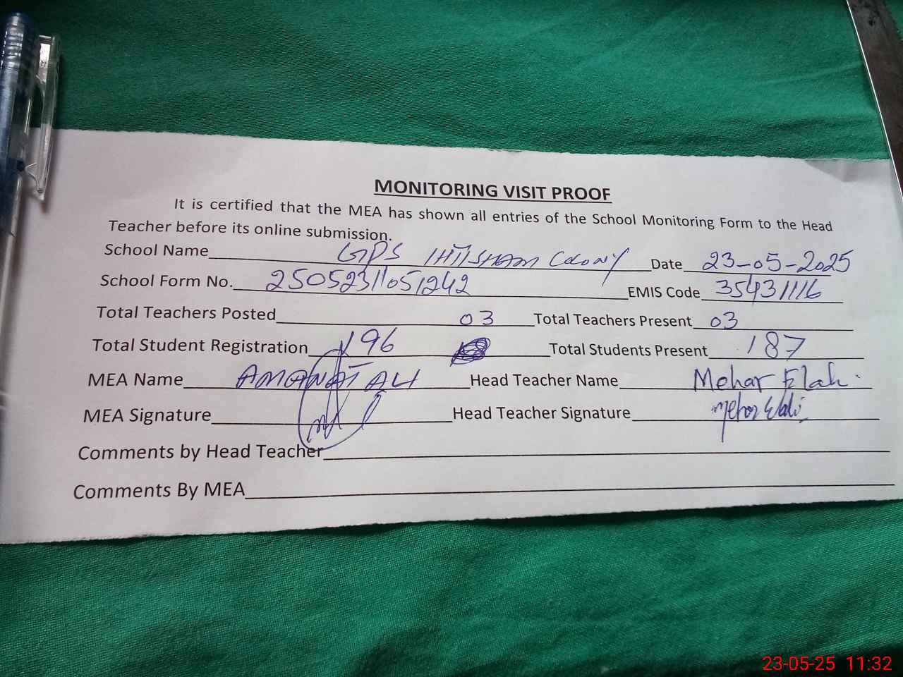 | Attendance Register | Head Teacher | MEA with School | Visit Proof |
