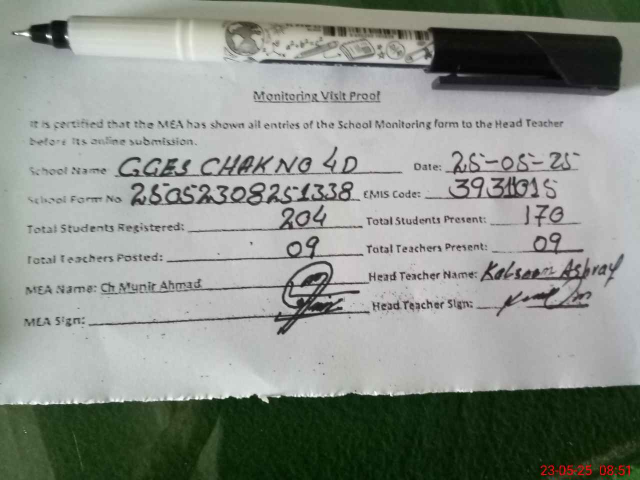 | Attendance Register | Head Teacher | MEA with School | Visit Proof |