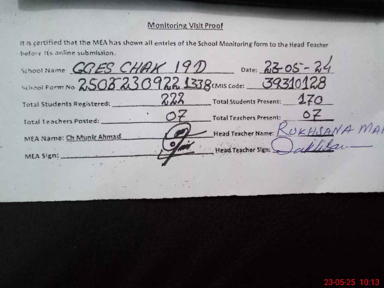 | Certified that this School was Inspected by the Undersigned MEA/DMO Today and the Information Stated Above is as Per Record. | |||||
