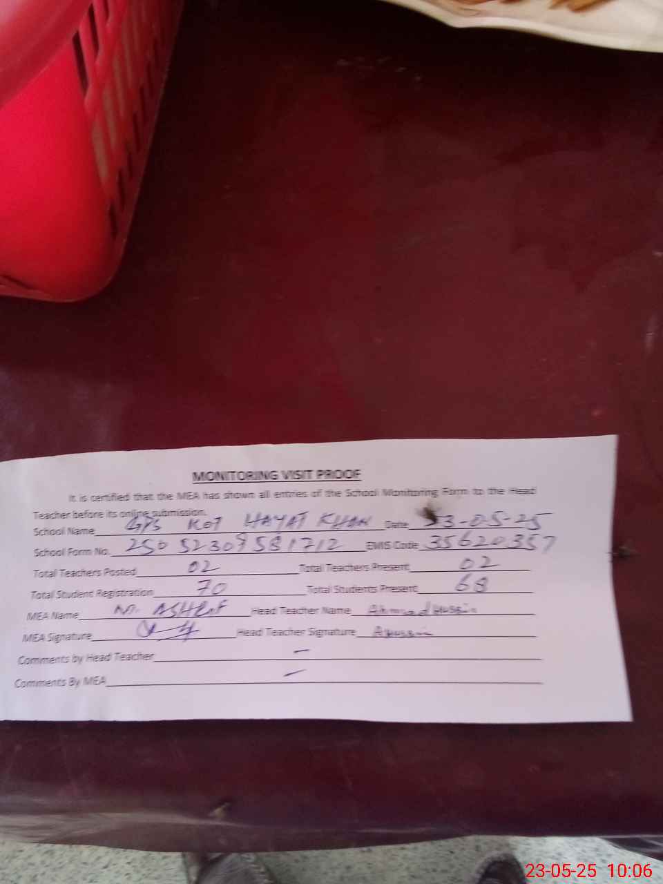 | Attendance Register | Head Teacher | MEA with School | Visit Proof |
