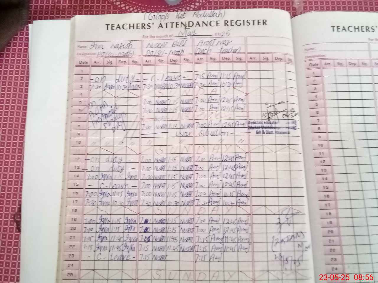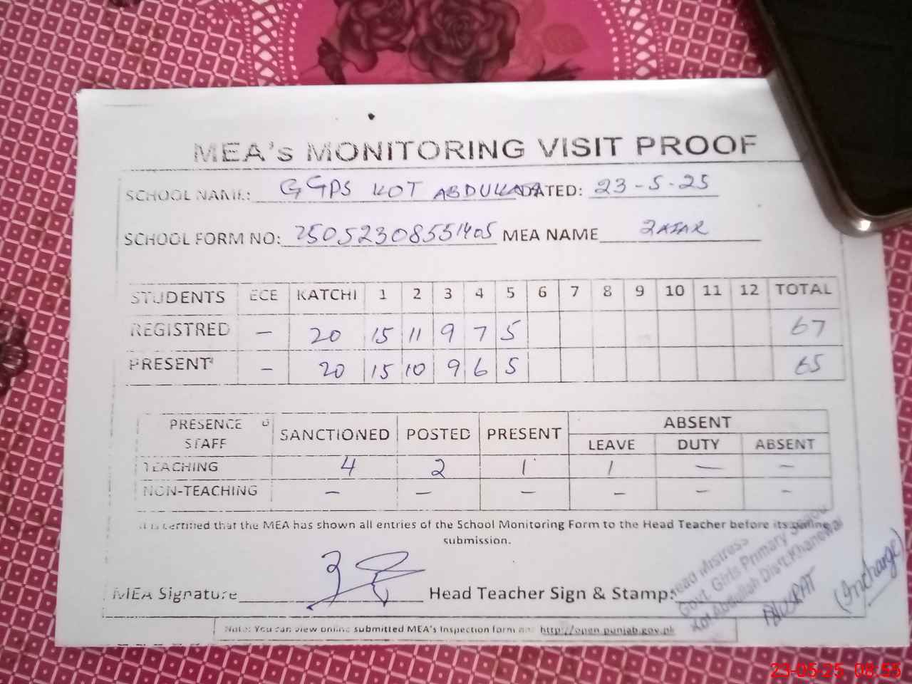 | Attendance Register | Head Teacher | MEA with School | Visit Proof |