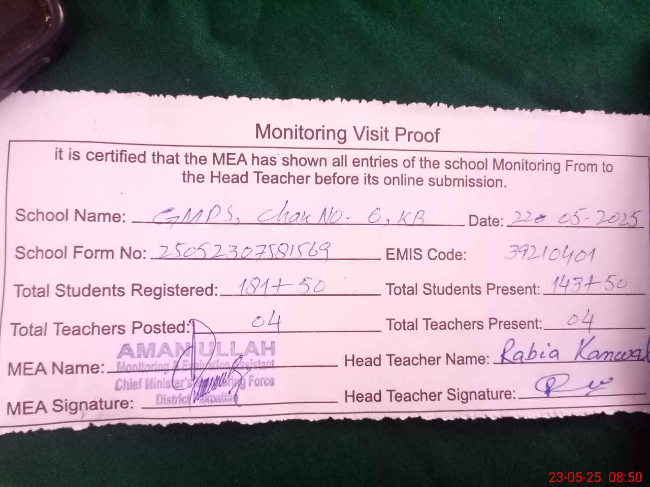 | Attendance Register | Head Teacher | MEA with School | Visit Proof |