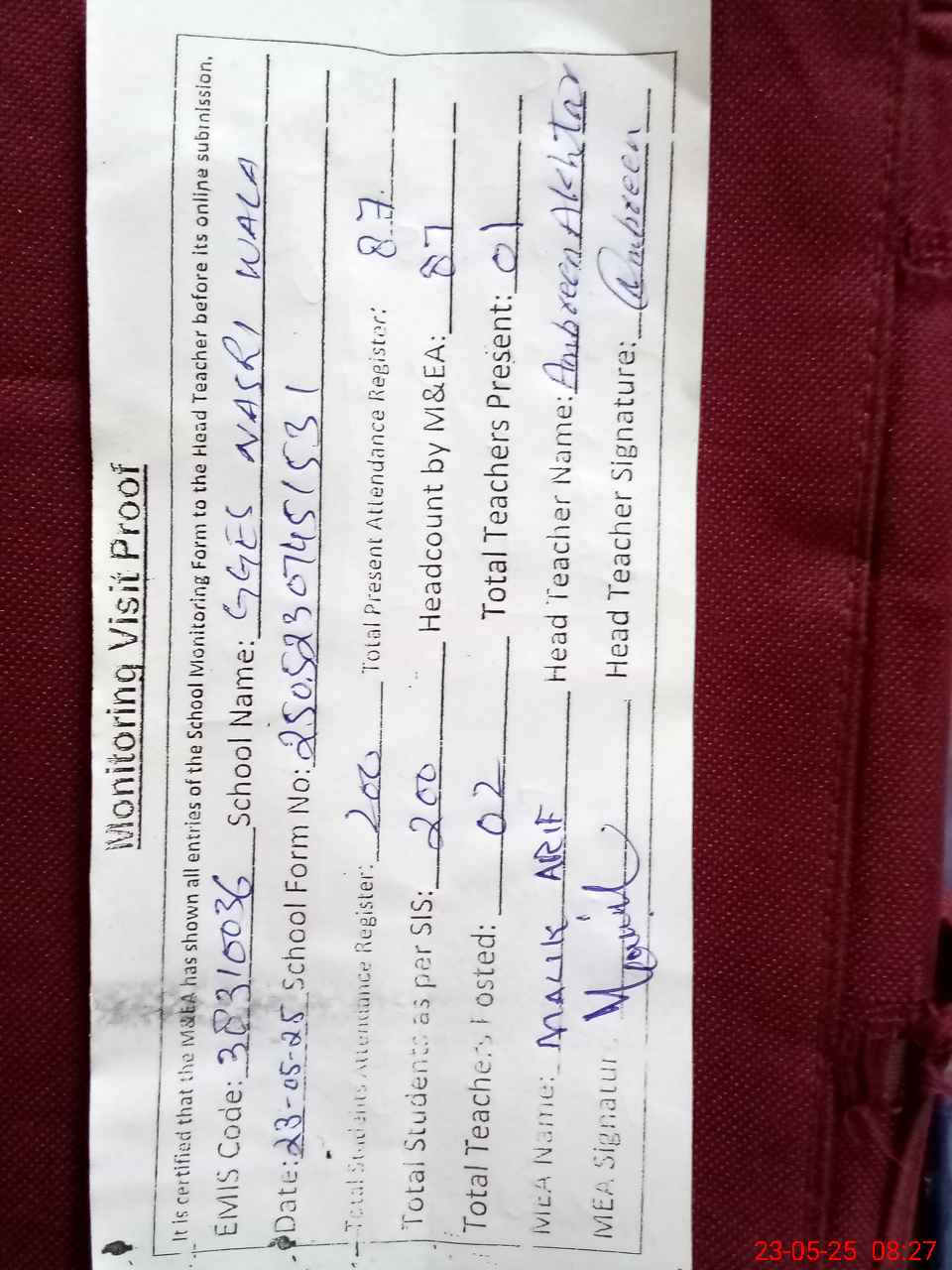 | Attendance Register | Head Teacher | MEA with School | Visit Proof |