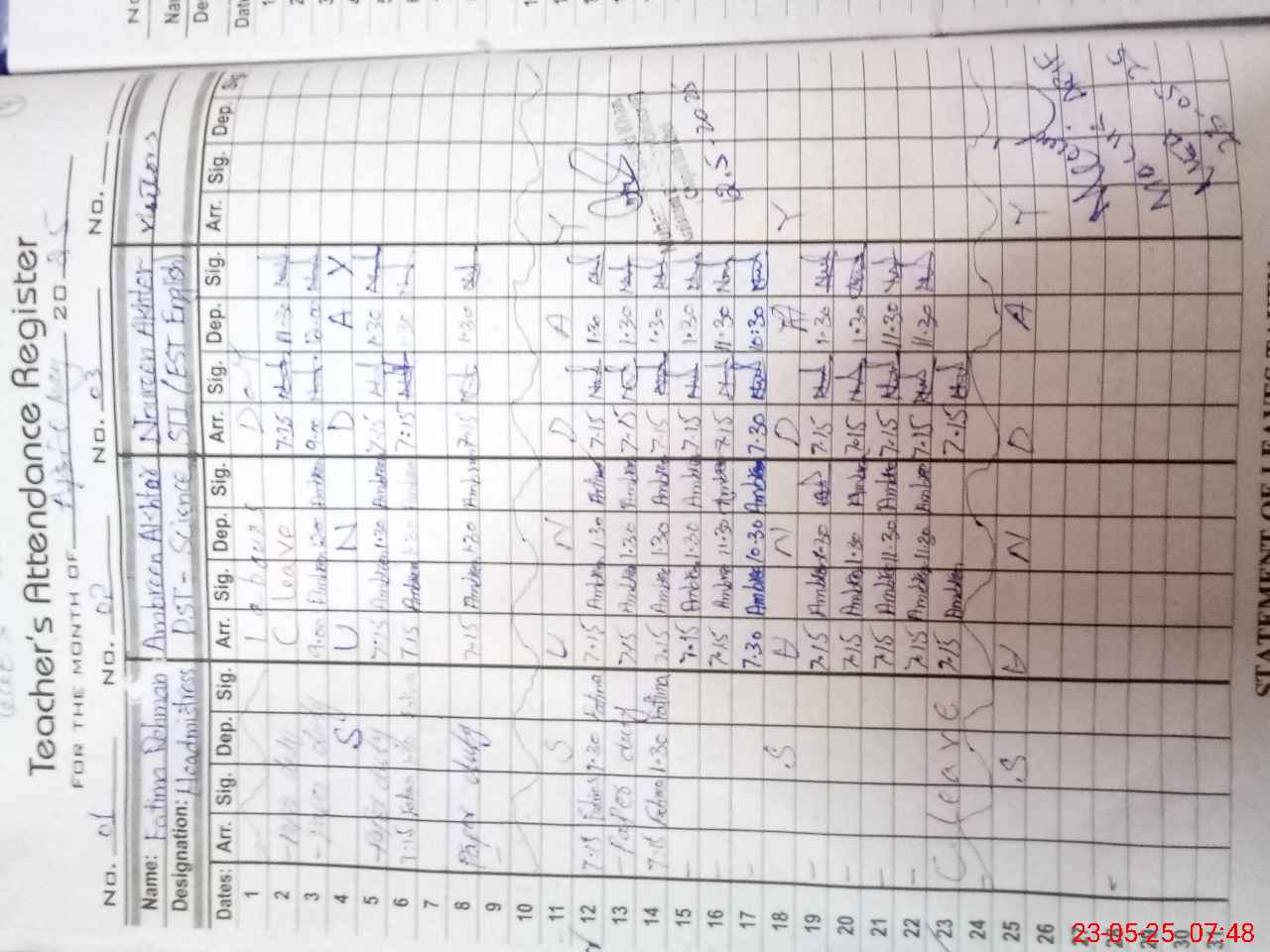 | Remarks (Use Separate Page if Required): Drinking water is acidulous Three toilets found blocked FTF record not available School council meeting register not available Teacher Mrs Fatima Rehman marked as absent as her leave is waiting for approval by the authories concerned | |||||