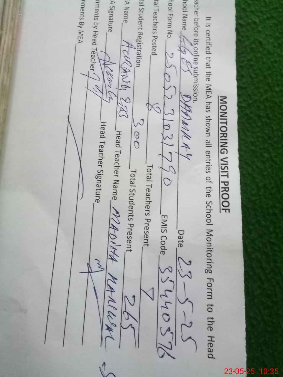 | Attendance Register | Head Teacher | MEA with School | Visit Proof |