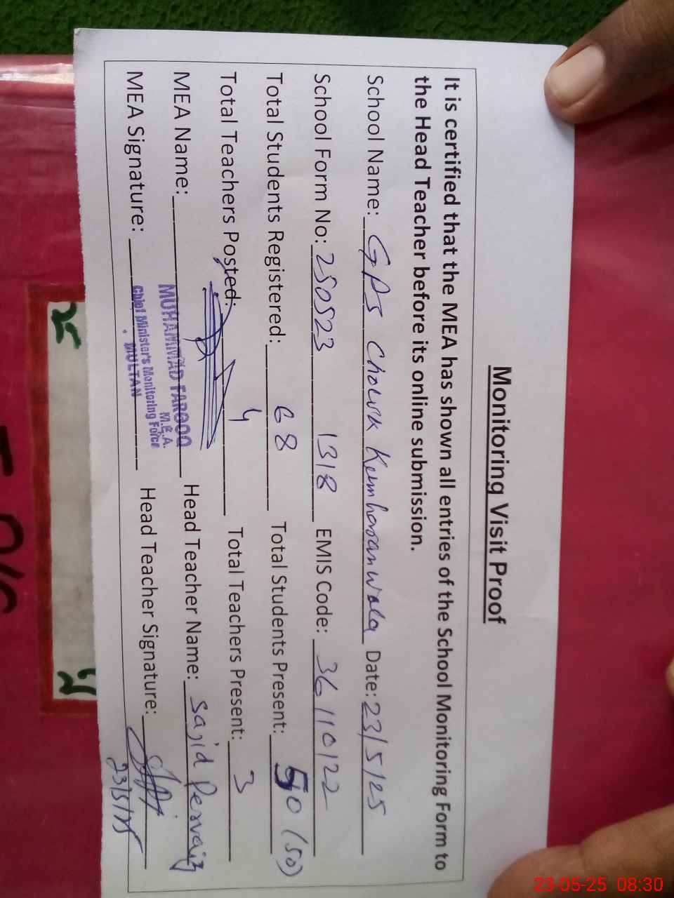| Attendance Register | Head Teacher | MEA with School | Visit Proof |