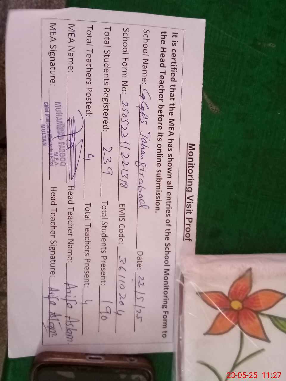 | Attendance Register | Head Teacher | MEA with School | Visit Proof |