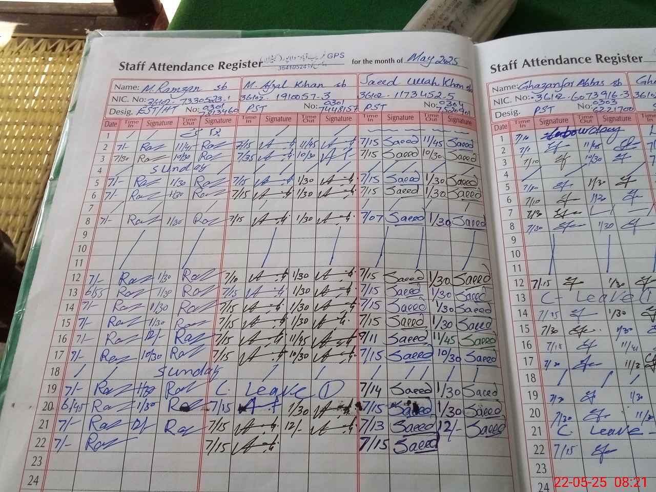 | CNIC | Full Name | Designation | R/C | Absence during last cal. month |