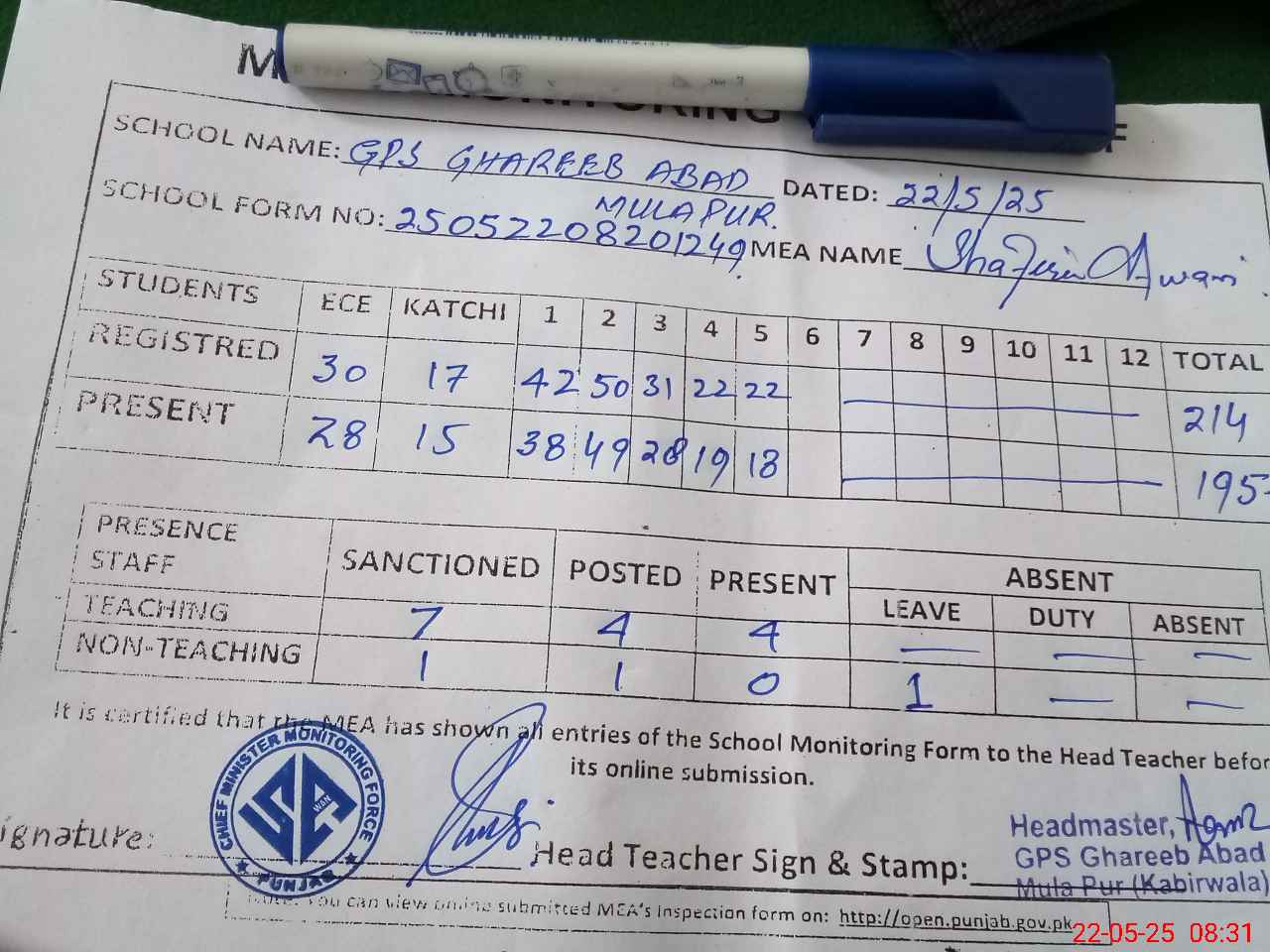 | Attendance Register | Head Teacher | MEA with School | Visit Proof |