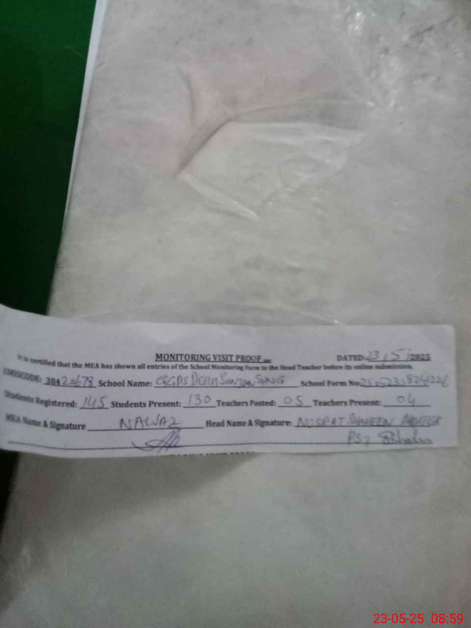 | Attendance Register | Head Teacher | MEA with School | Visit Proof |