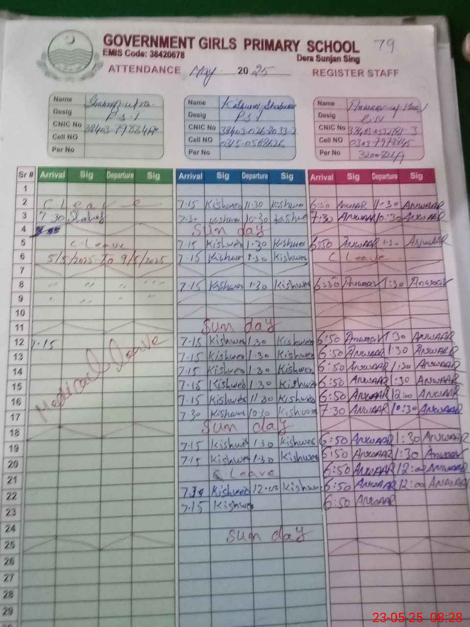 | CNIC | Full Name | Designation | R/C | Absence during last cal. month |