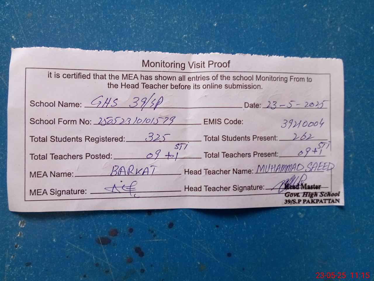 | EMIS Code: 39210004 | Name of School: GHS 39/S.P | |||