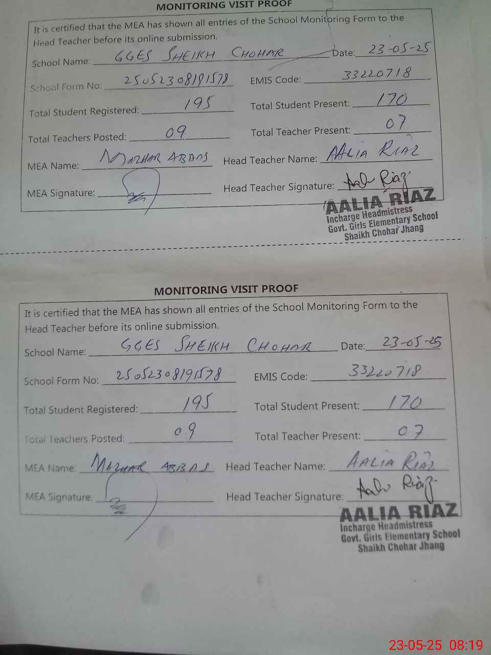 | Attendance Register | Head Teacher | MEA with School | Visit Proof |