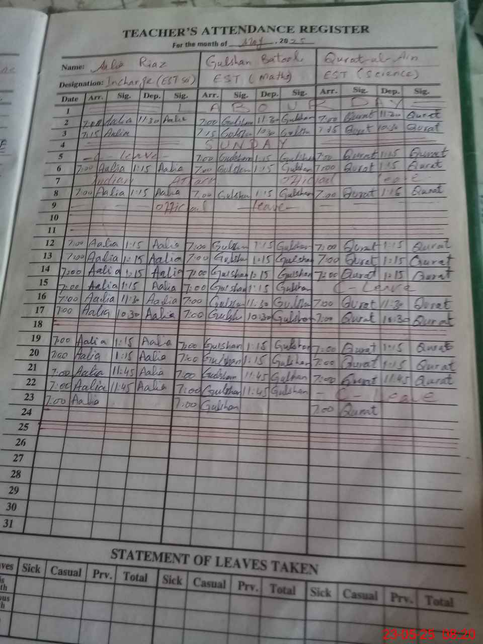 | 33**** | Ta**** Sa**** | 1 | 1 | 0 | 0 | 0 | 0 | 0 | 0 | 0 | 0 | 0 | Exam Duty |