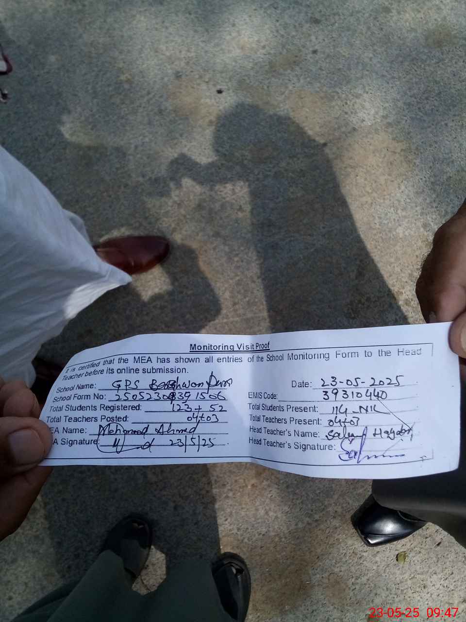 | Attendance Register | Head Teacher | MEA with School | Visit Proof |