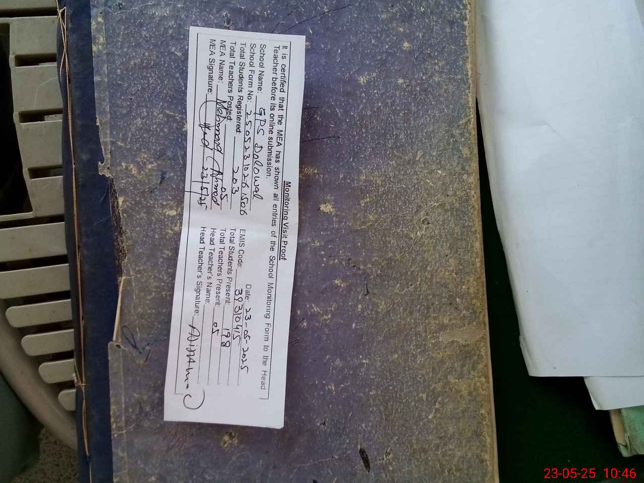 | Attendance Register | Head Teacher | MEA with School | Visit Proof |