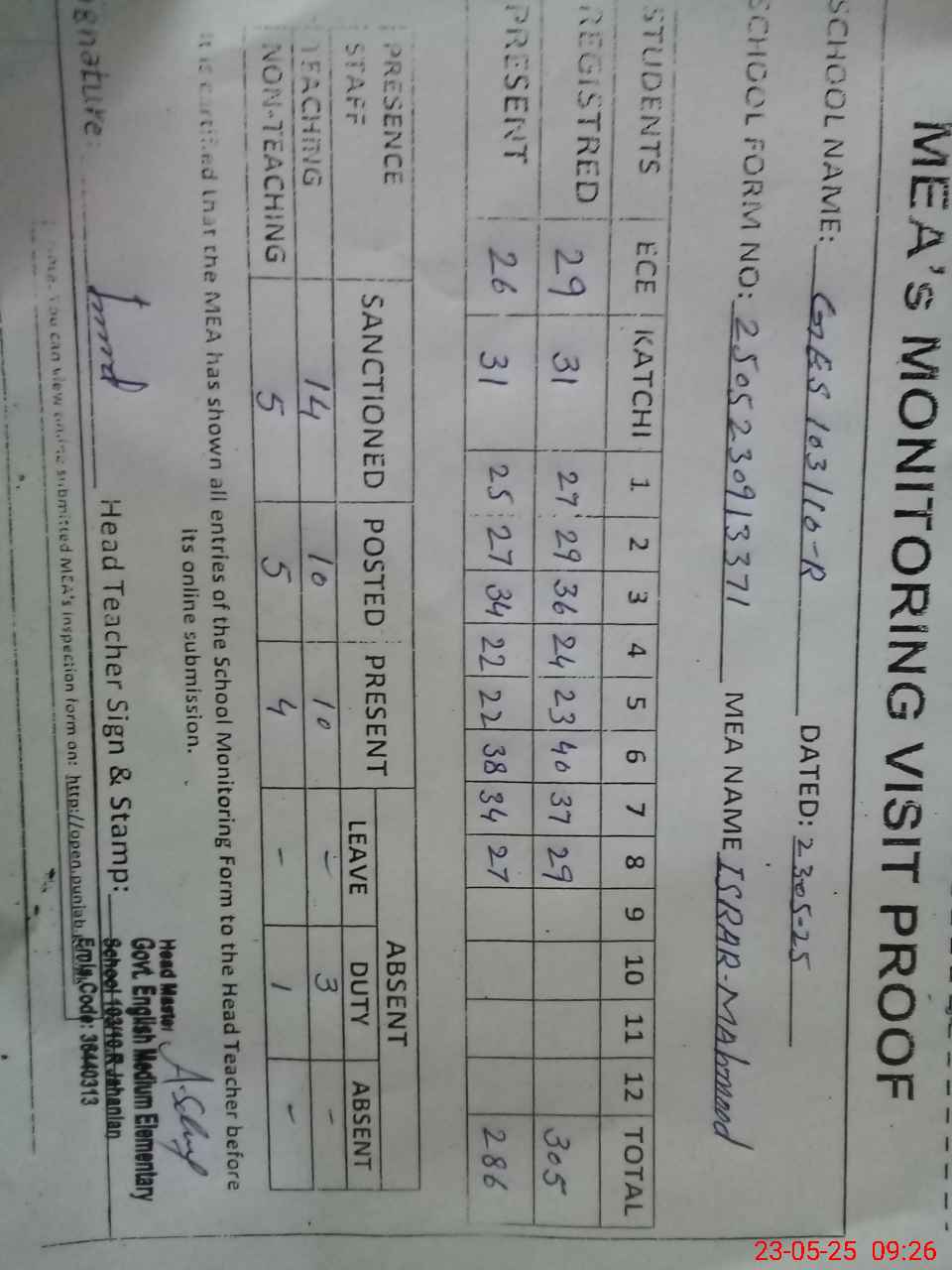 | Attendance Register | Head Teacher | MEA with School | Visit Proof |
