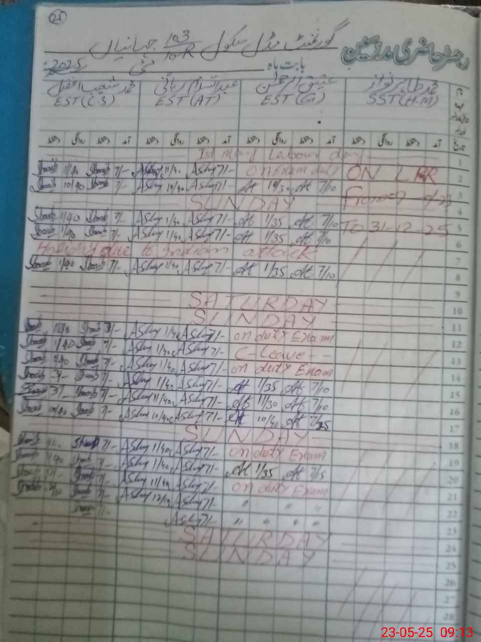 | 36**** | Sa**** UrRe**** | EST | Regular | 0 | 0 | 0 | 0 | 0 | 0 | 0 | 0 | 0 | Exam Duty |