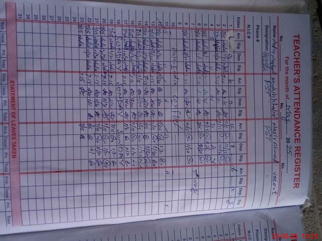 | CNIC | Full Name | Designation | R/C | Absence During Last Calender Month |