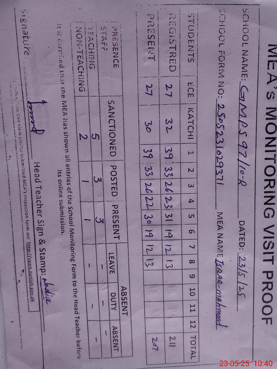| Attendance Register | Head Teacher | MEA with School | Visit Proof |