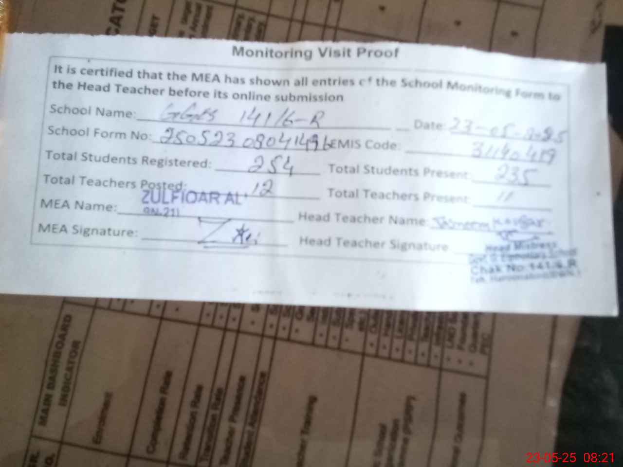 | Attendance Register | Head Teacher | MEA with School | Visit Proof |