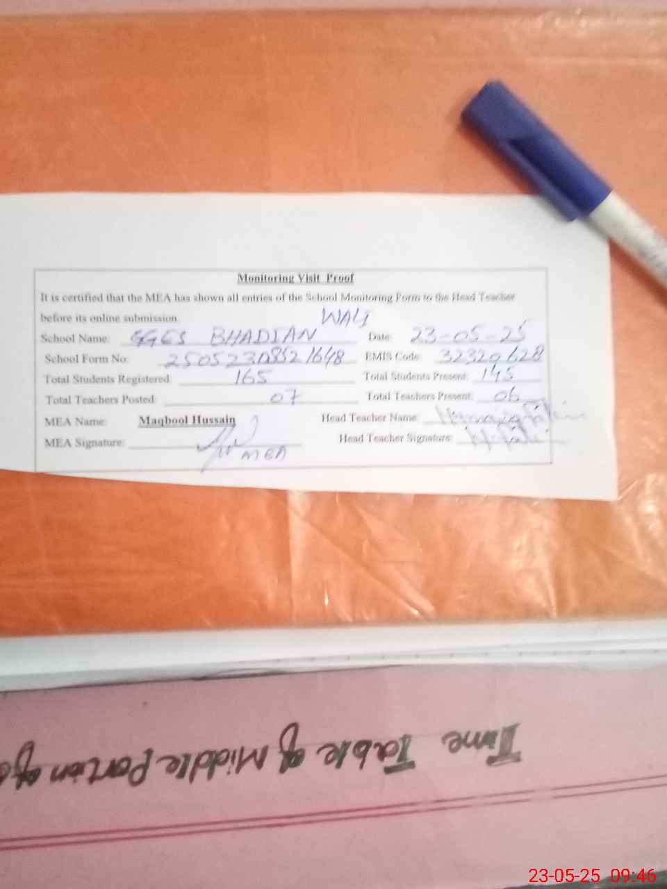 | Attendance Register | Head Teacher | MEA with School | Visit Proof |