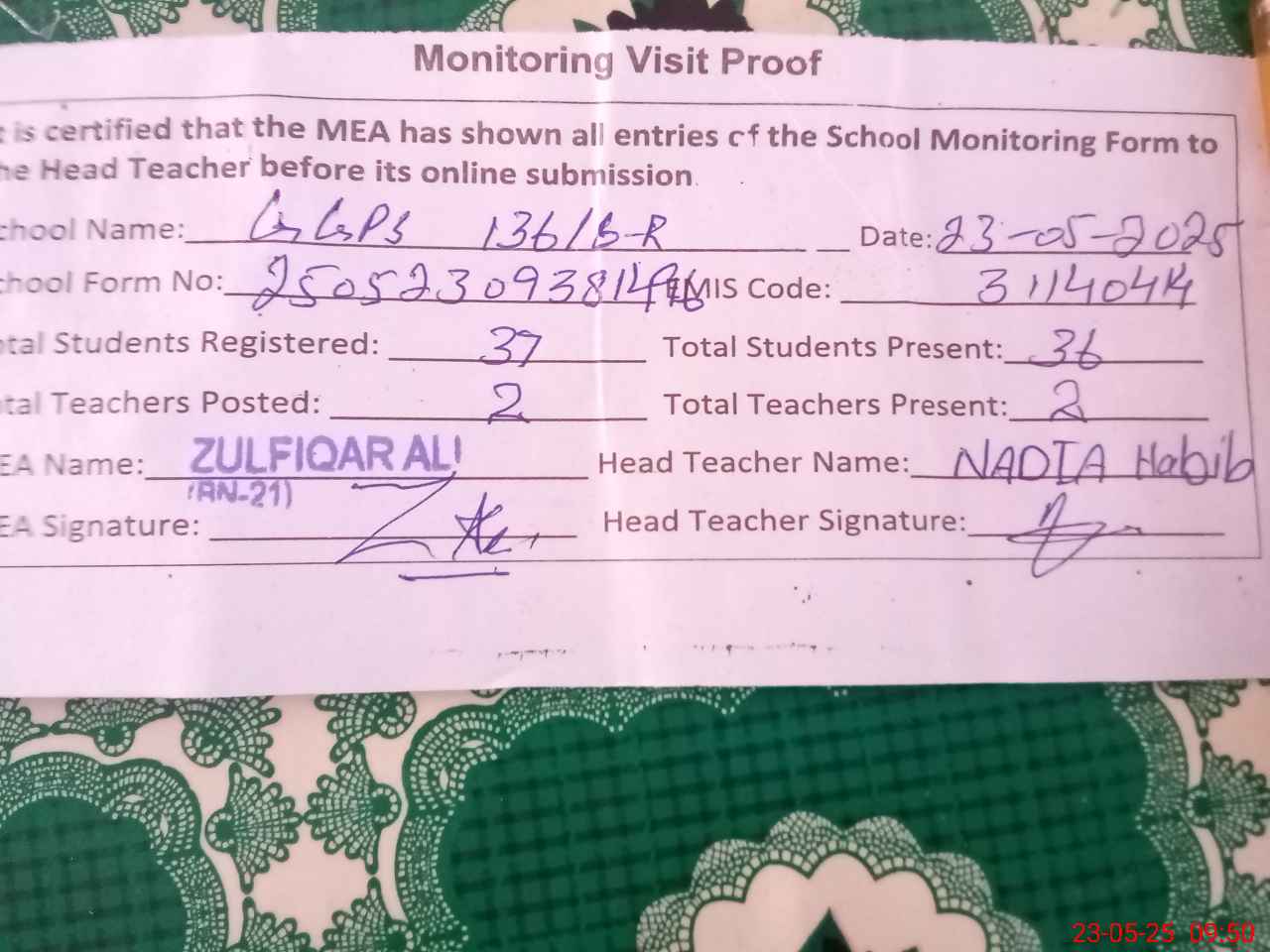 | Attendance Register | Head Teacher | MEA with School | Visit Proof |