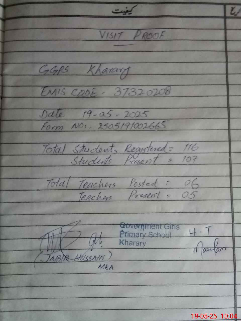 | Total no. of Classrooms: 4 No. of Classrooms Used for Teaching: 3 No. of Classrooms Storing Old Furniture, FTBs, etc: 0Comments if Any: One teacher name Fouzia Rani PST attached from GGPS Dhall UC Phagwari school out source vide notification no 120 dated 11th march 2025 One teacher name Ume Rabab PST on official duty exam duty of BISE Rawalpindi vide notification no 200722 dated 28 th Ap |