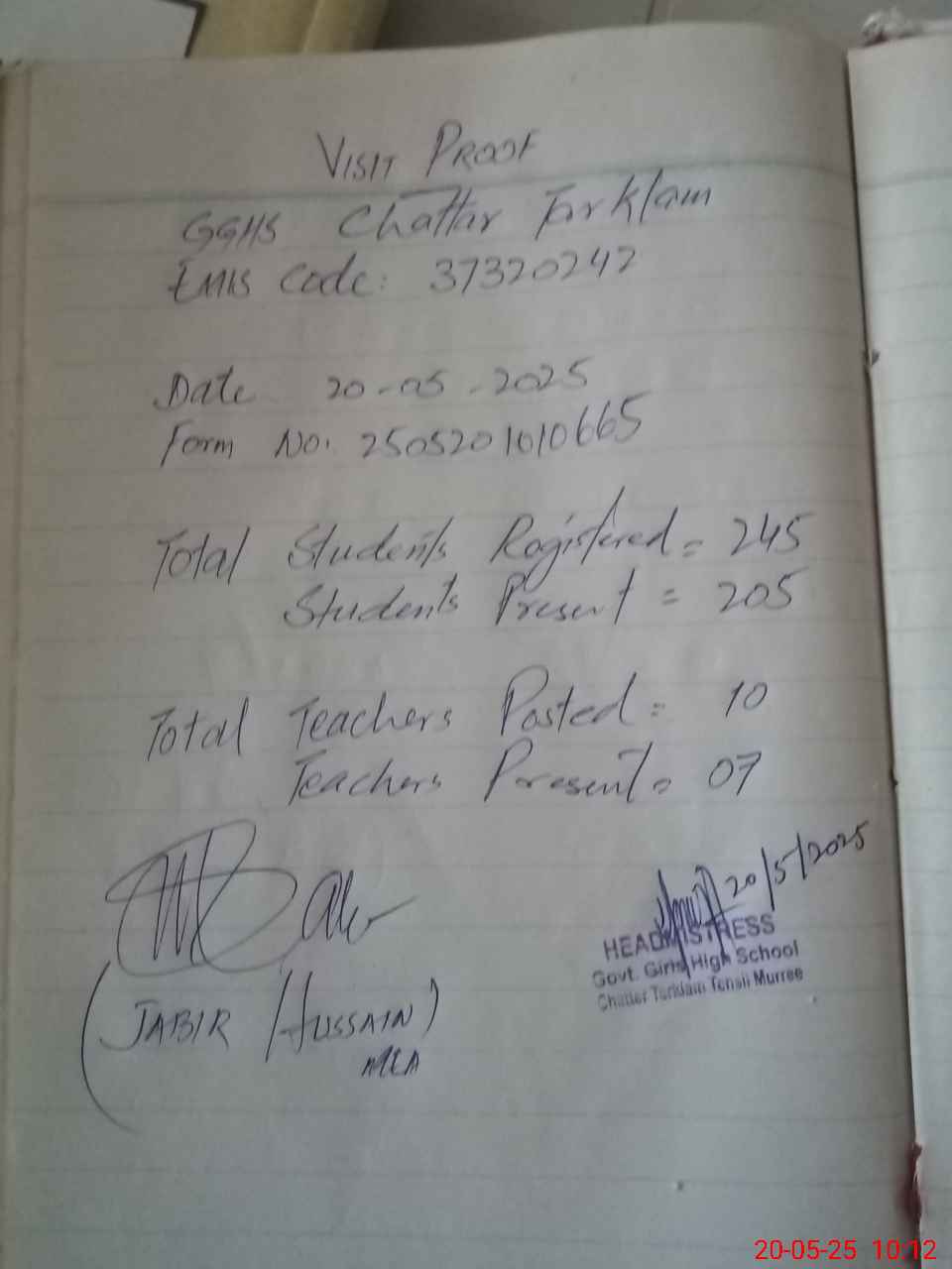 | Total no. of Classrooms: 8 No. of Classrooms Used for Teaching: 6 No. of Classrooms Storing Old Furniture, FTBs, etc: 0Comments if Any: 03 STIs attached on contract base wef 1st April 2025 to till date and present and attendance marks on register regularly and also physically present today 1 Mehwish Abid Designation SSE CS 2 Rabiya Asad Destination SSE Math 3 Atiy |