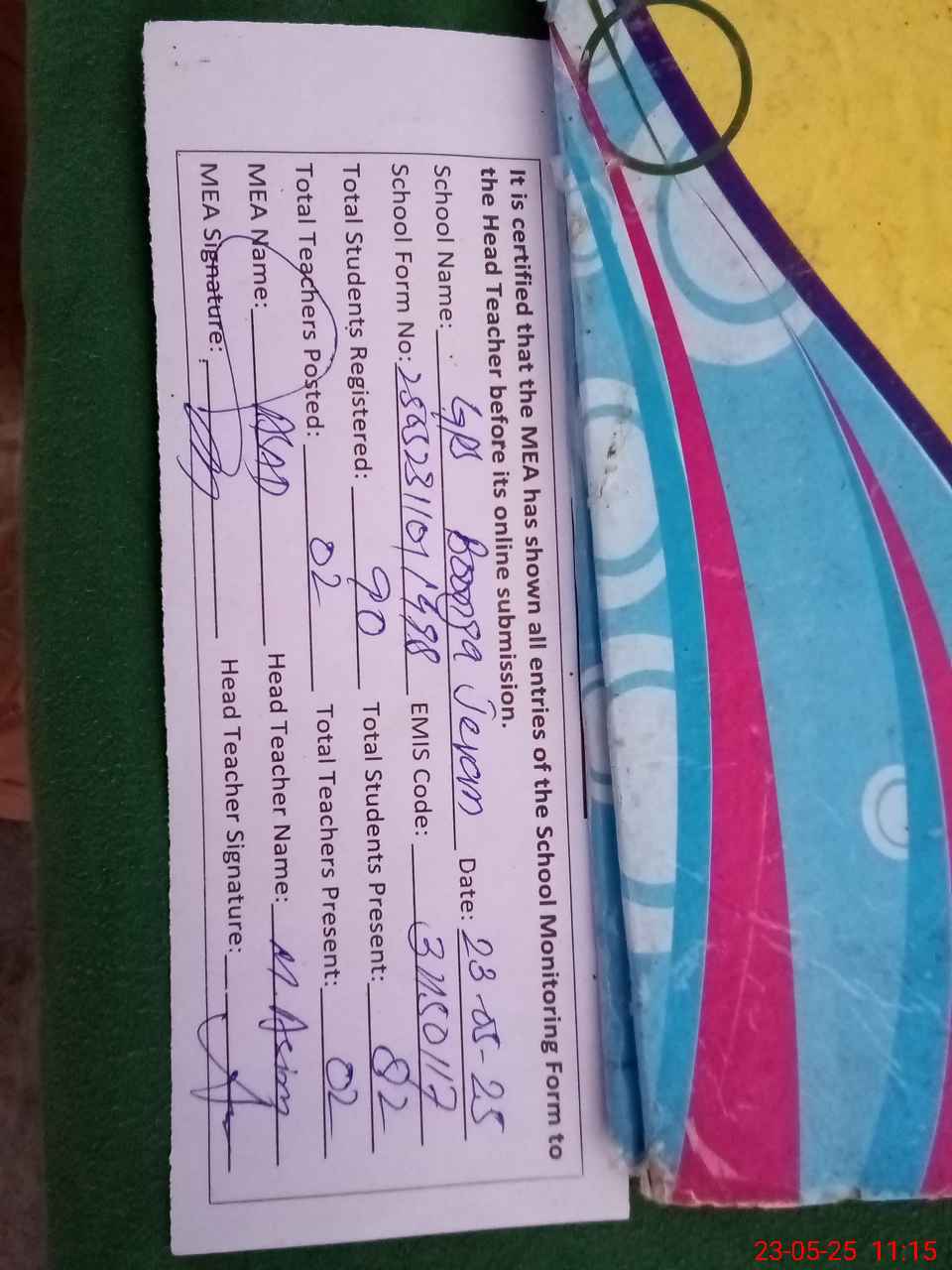 | Attendance Register | Head Teacher | MEA with School | Visit Proof |